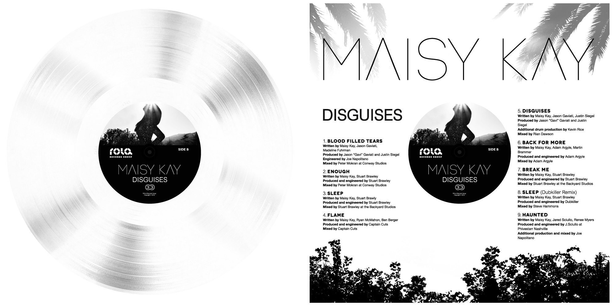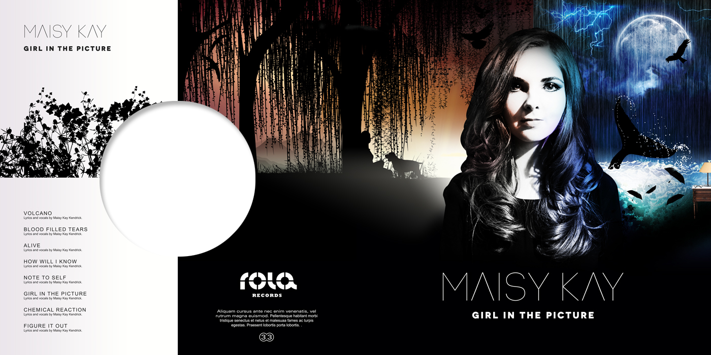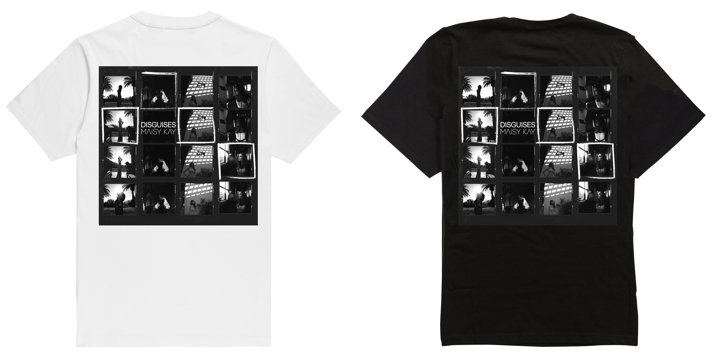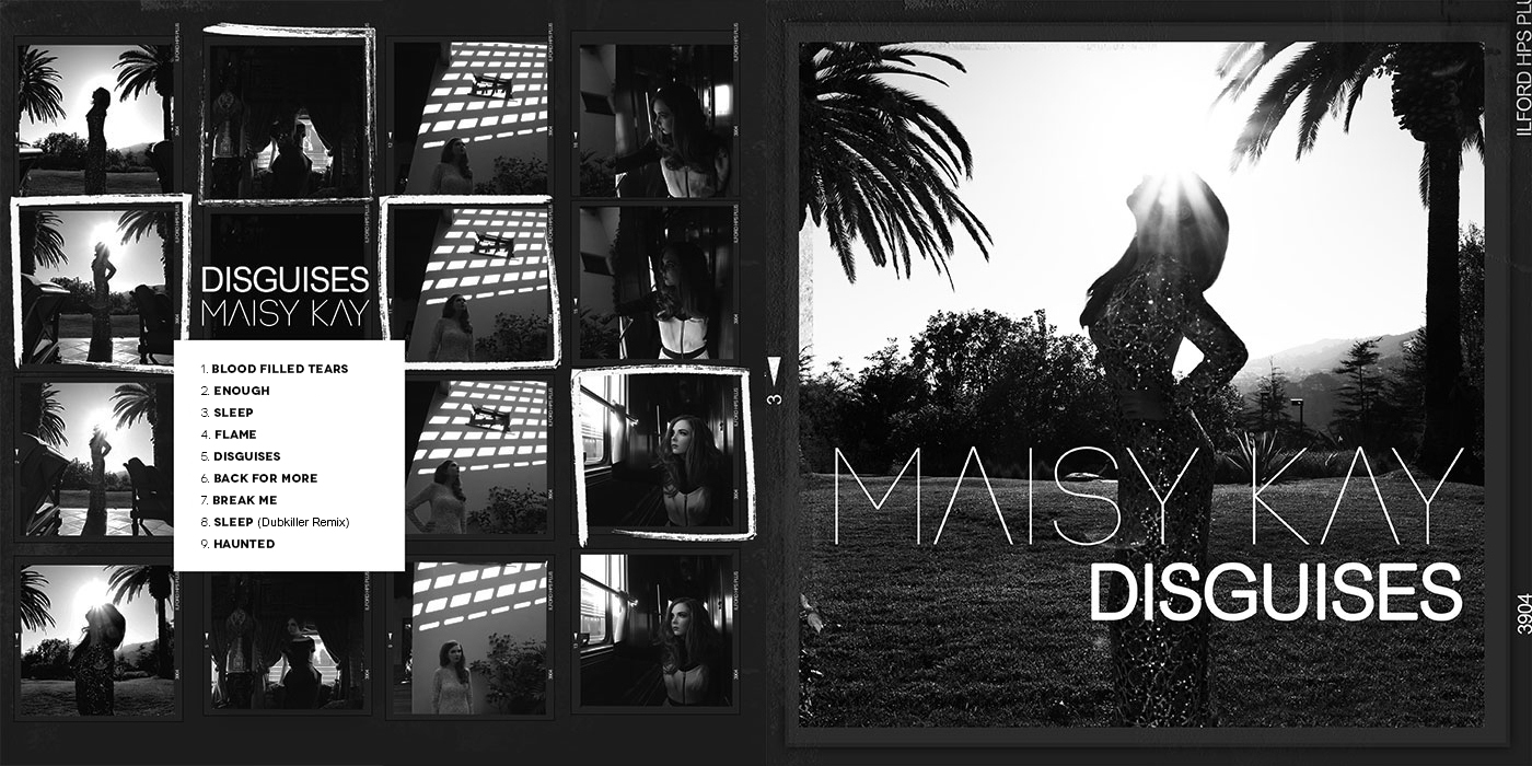 The design for the Maisy Kay, Disguises EP, brings together the various photo shoots and videos from the EP and previous singles combined to form a contact sheet of photographs. The work is based on conversations with Maisy and was intended to show the continual process of, assessment, reflection, rejection and selection a musician or artist has to go through. The artwork concept aludes to the superficial, style-over-substance nature of the music industry as a whole.