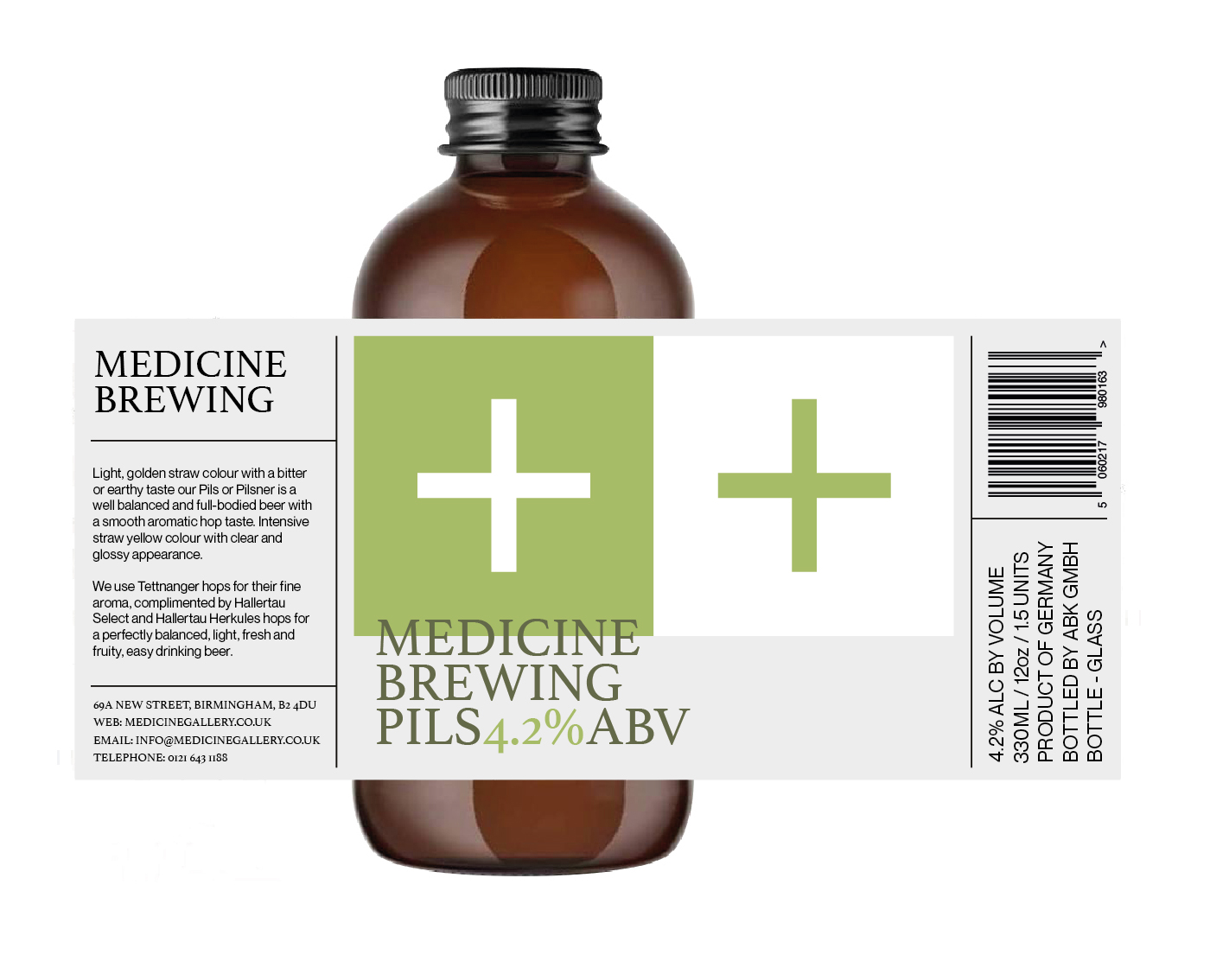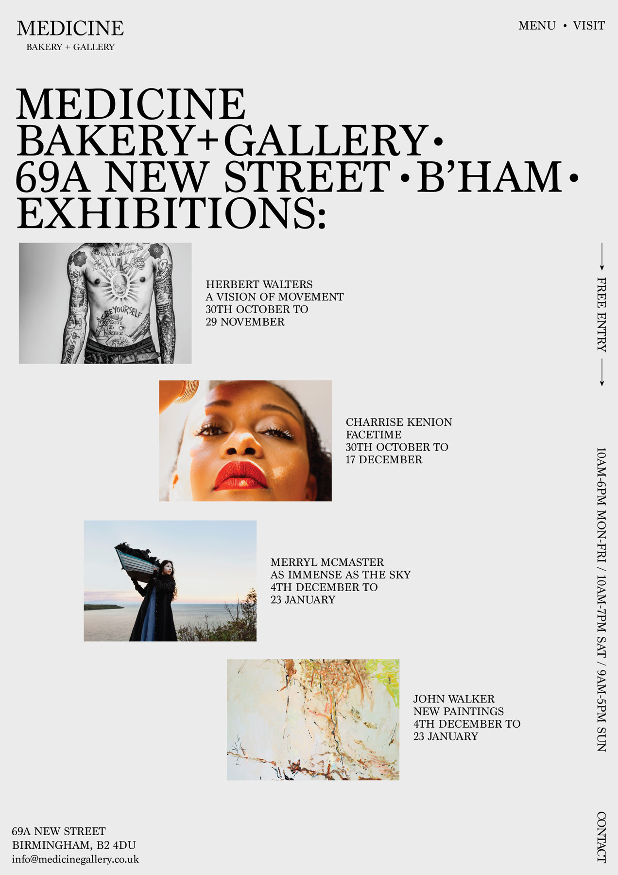 Branding, poster and website concepts for Medicine Bakery + Gallery. I also provided design ideas for the gallery interior and serving spaces, including lighting rigs and storage facilities featuring the architectural styling of the building the gallery occupies, plus branding and packaging designs for the Medicine's own range of craft beers and cider. All images the property and copyright of the artists.