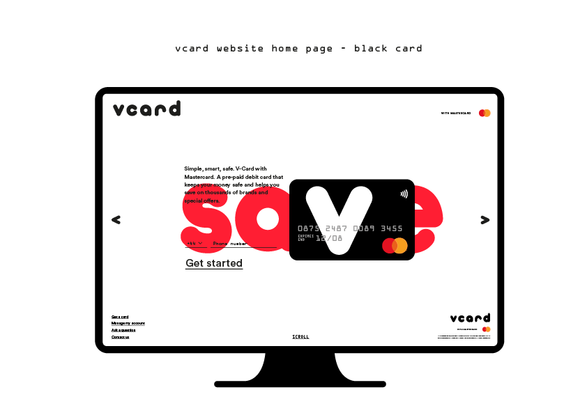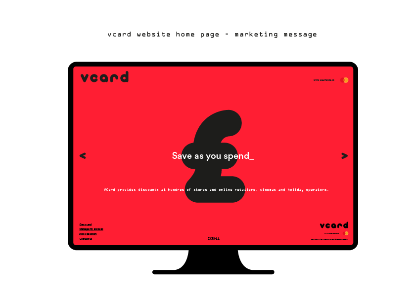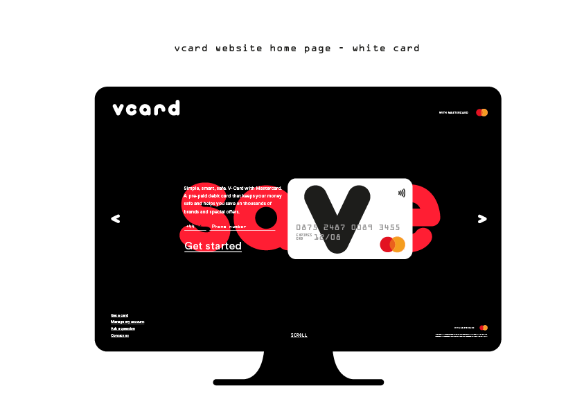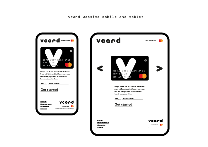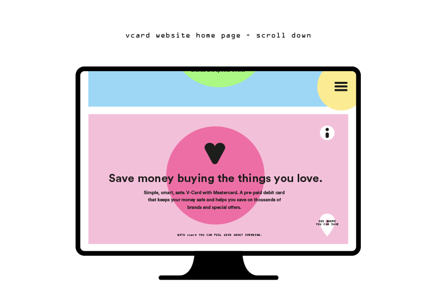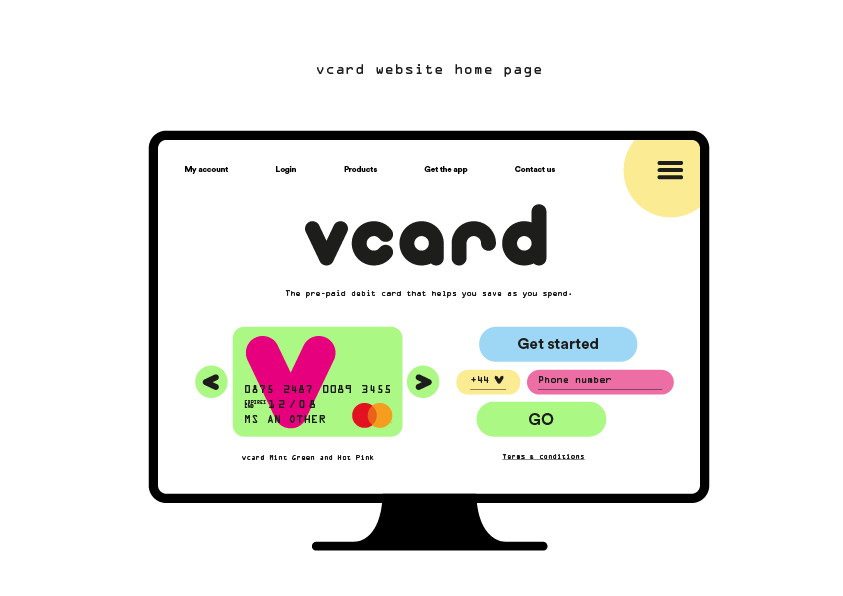 Branding, identity and UI design for a pre-paid Mastercard provider. The project included physical card design, UI design and prototyping of sign-up website and account management application plus the development of a custom graphic language to support the Vcard branding. Clean minimal design and cool colourways. Choose the combination that best fits your world or create your own from a pallet of over 30 colours.